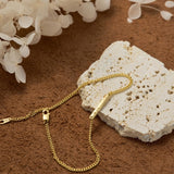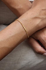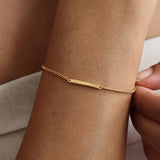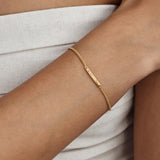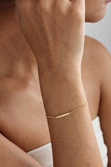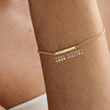 This Mountain Morse code bracelet features a unique twist on the traditional Morse code, with an engraving inspired by mountain peaks. The minimalist gold bar and fine chain create a sleek yet meaningful design, perfect for those who love adventure and nature. This special engraving adds a personal and symbolic touch, making it a distinctive piece for everyday wear or a thoughtful gift.